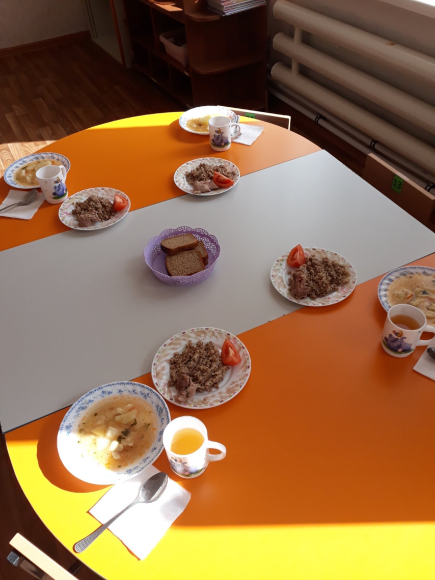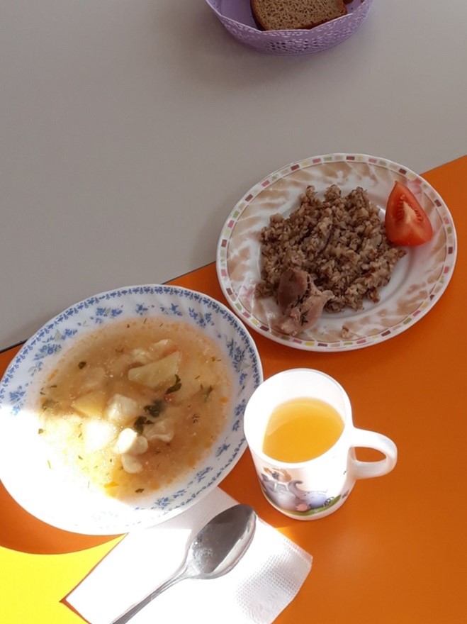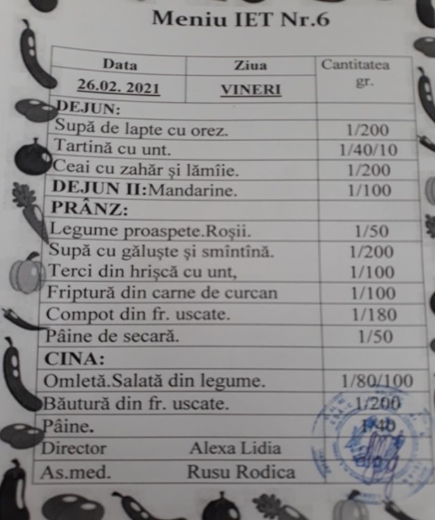 În meniul zilnic sunt incluse fructe proaspete, legume, salate proaspete, carne, pește, ouă, asigurând creșterea și dezvoltarea tinerii generații cu bucate sănătoase și vitaminoase.