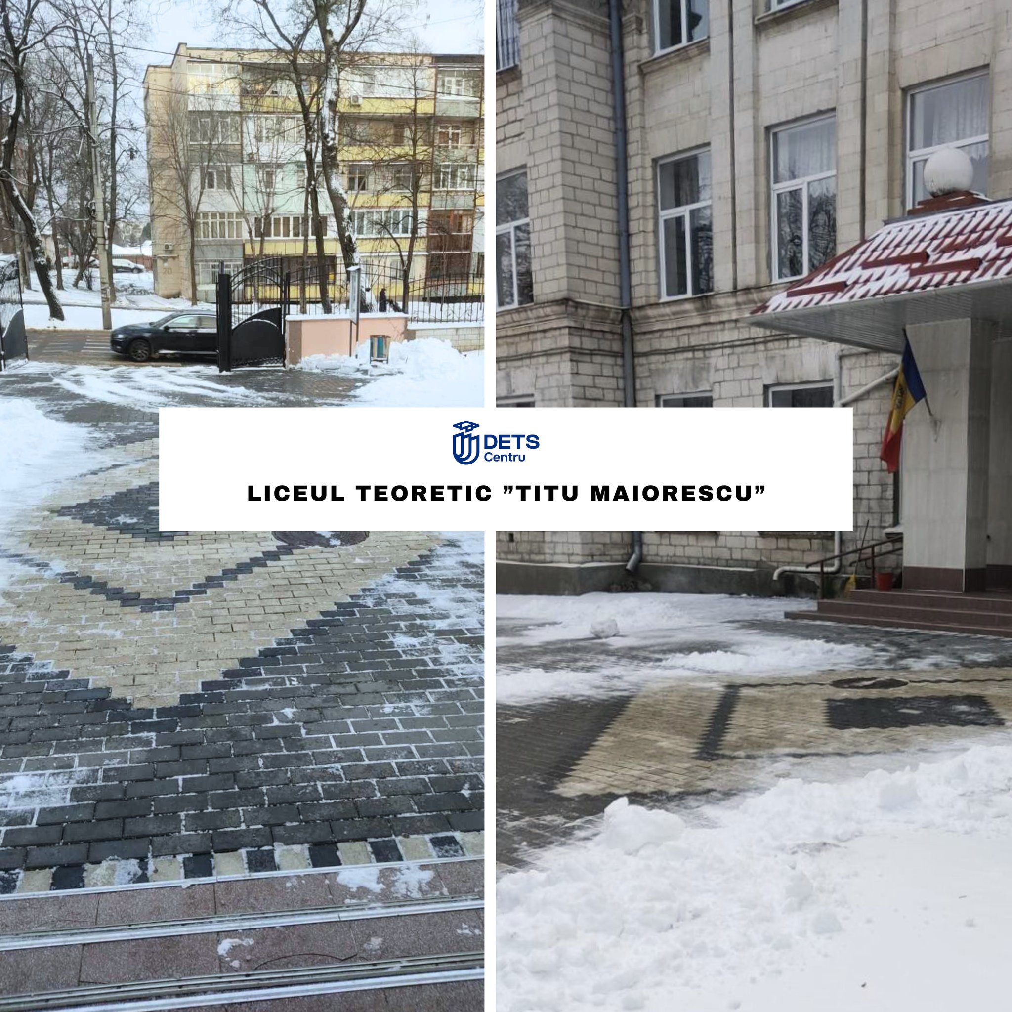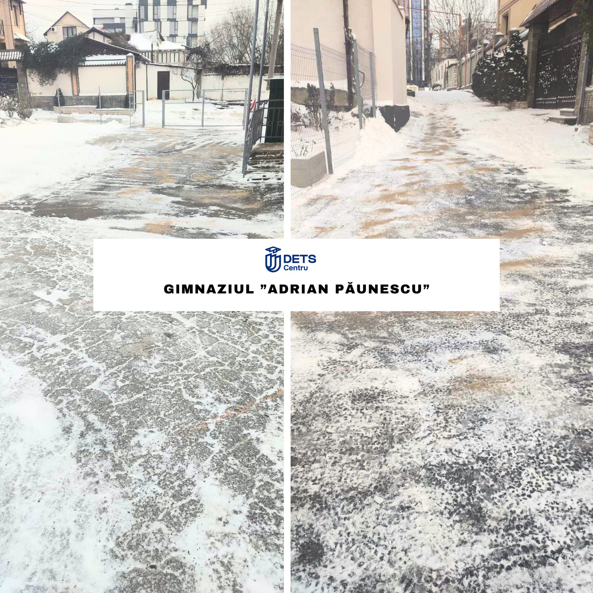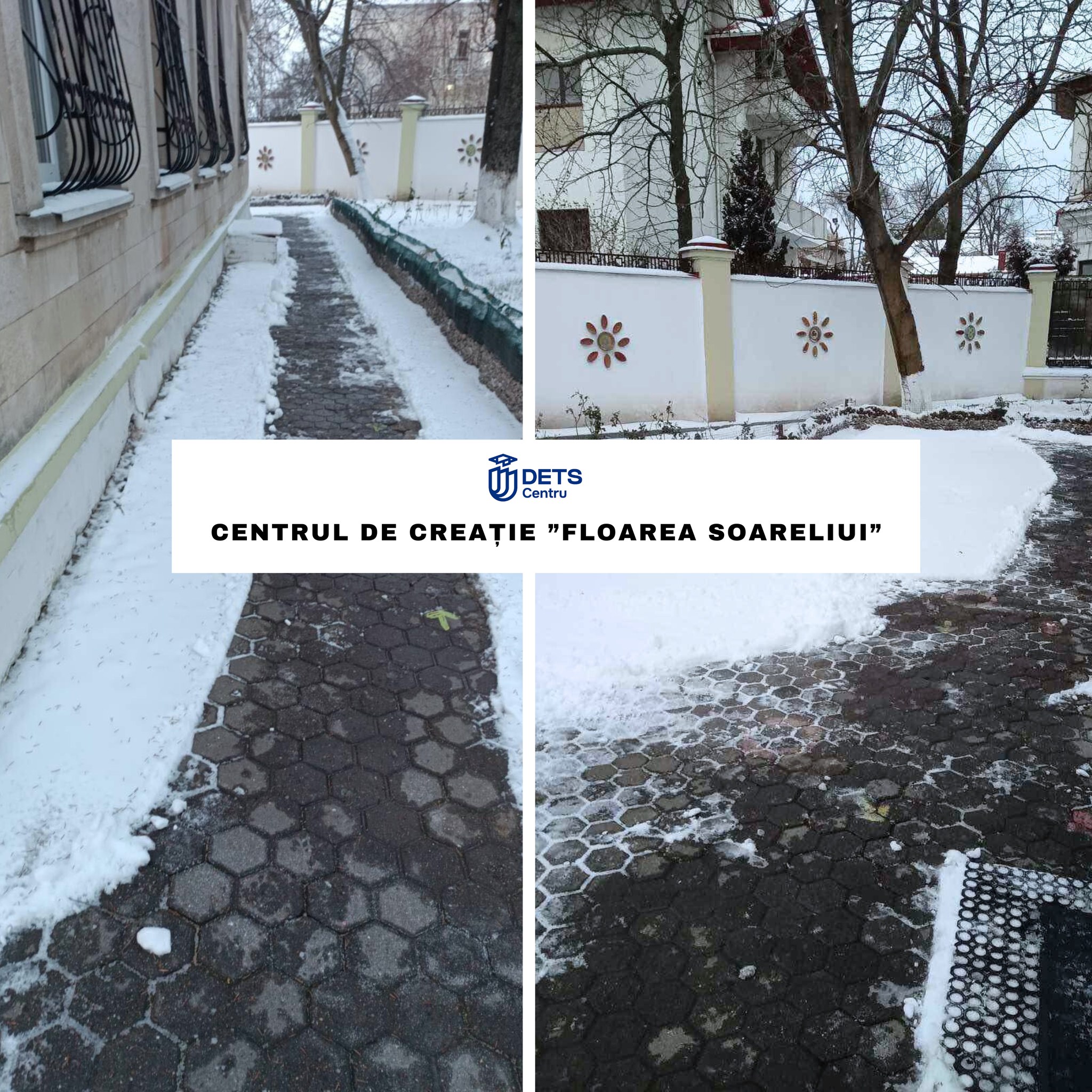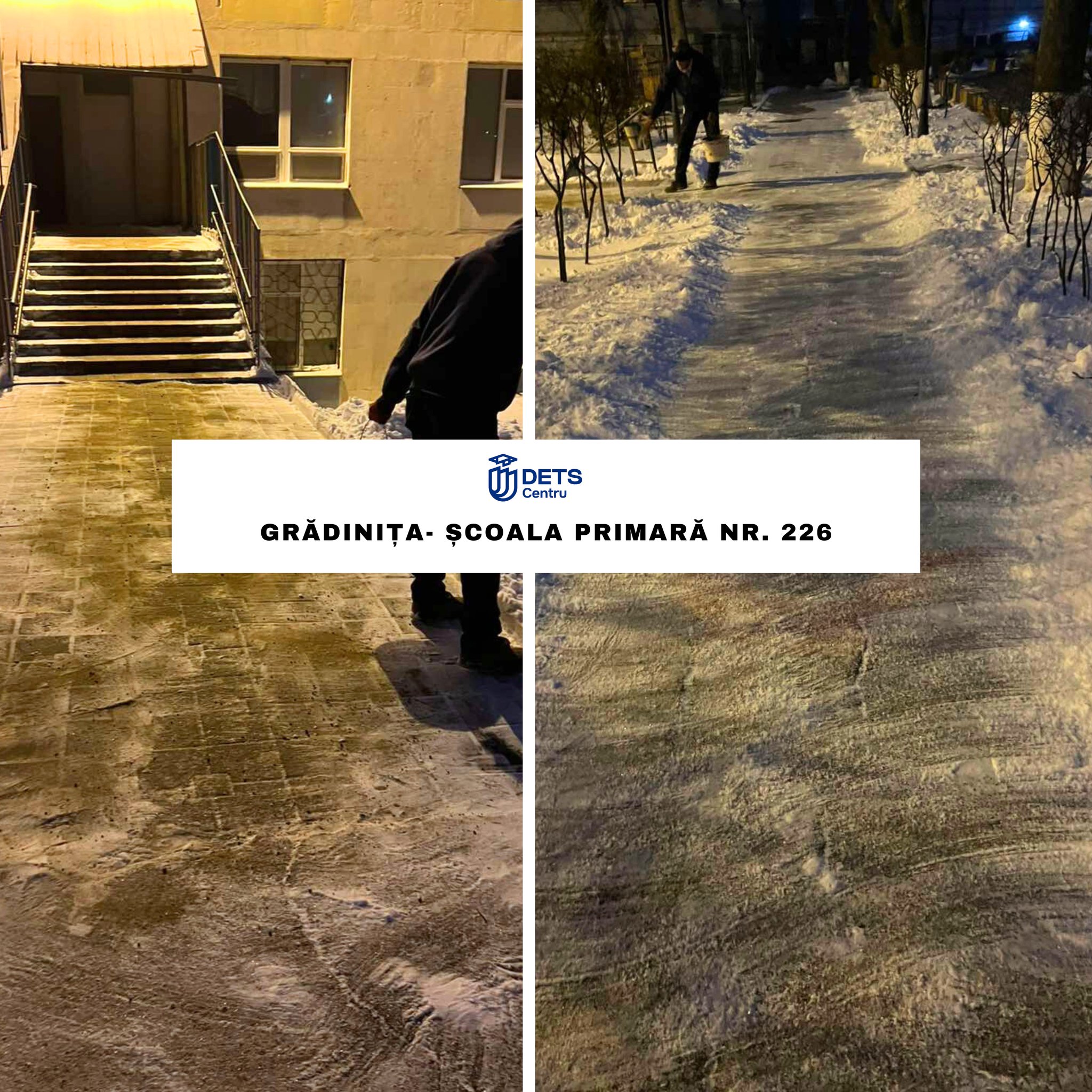 În contextul ninsorii din data de 8 ianuarie, angajații instituțiilor de învățământ din sectorul Centru au intervenit începând de ieri, precum și astăzi, din primele ore ale dimineții, pentru înlăturarea stratului de zăpadă și presurarea materialului antiderapant solid, în vederea combaterii poleiului.