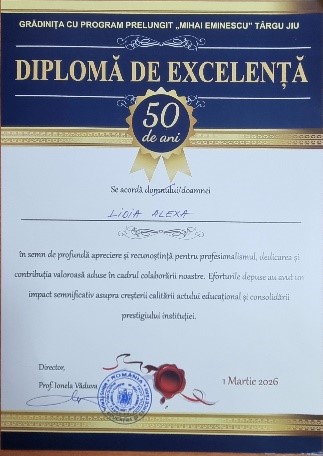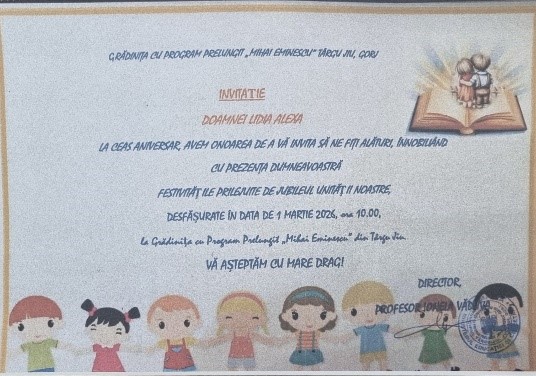 Directoarea Grădiniței de copii nr.6 Alexa Lidia, onorată să fie invitată și participa la Aniversarea de 50 de ani ai Grădiniței cu Program Prelungit ,, Mihai Eminescu,, din Târgul Jiu, Rămânia. ,, Pentru noi nu este numai un schimb de experiență între parteneri, dar și o stare sufletească, ce ne-a făcut să mai revinim,, Suntem recunoscătoare Dnei director Ionela Văduva și întregului colectiv al Grădiniței cu Program Prelungit ,, Mihai Eminescu,, . Prietenia noastră trece dincolo de granițe, pentru că în inimile noastre există doar căldură și deschidere.
